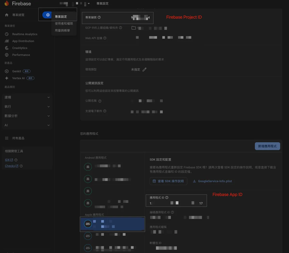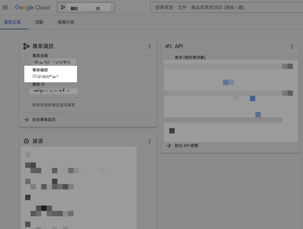 Therefore, you need to create a GCP project (a Firebase GCP project is also acceptable), note the “Project Number” on the information homepage, and ensure that this GCP project has the Google APIs you want to use enabled, and that the currently logged-in account or the account you want to use has the necessary permissions for the GCP project and Google APIs.