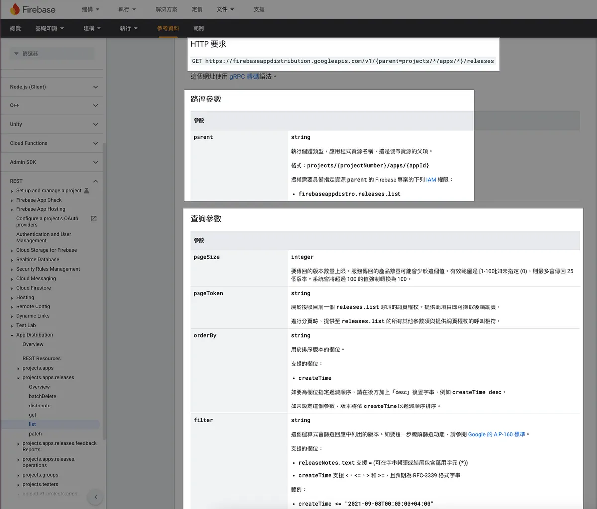// Filter: https://firebase.google.com/docs/reference/app-distribution/rest/v1/projects.apps.releases/list?hl=zh-tw