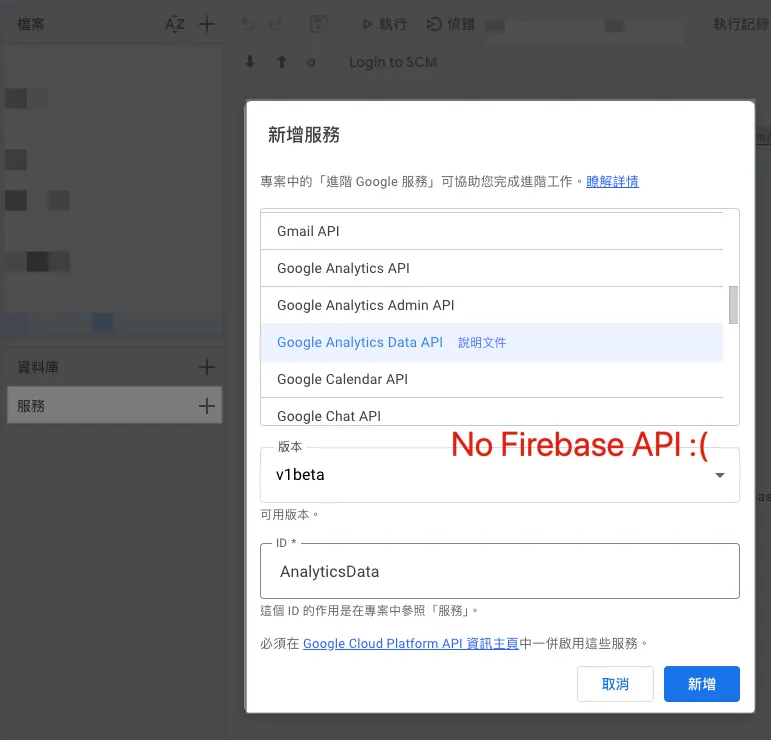 As shown in the above image, unlike the built-in “AnalyticsData” service for connecting with Google Analytics, Firebase App Distribution does not offer a built-in integration service, so an advanced method is required for integration.