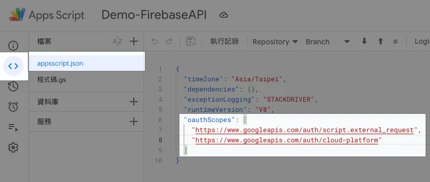After enabling, return to the editor, and the file list will show the appsscript.json configuration file: