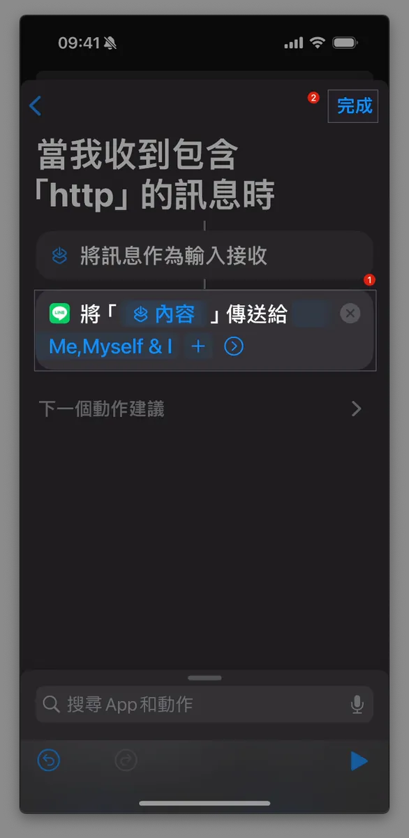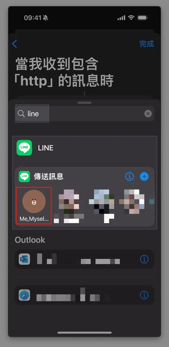 「line」in the search box to find the shortcut feature provided by Line, then select Line’s「Send Message」and choose the target you want to send to.