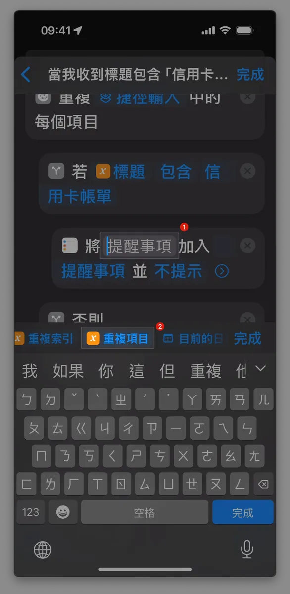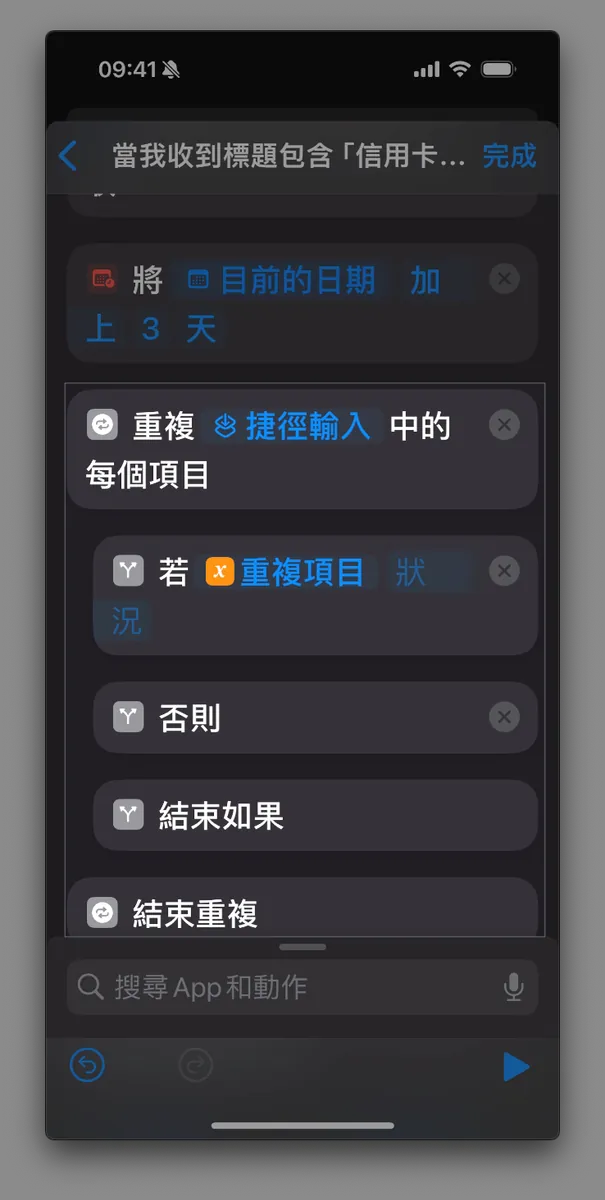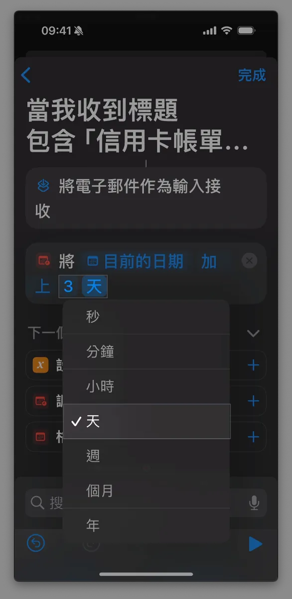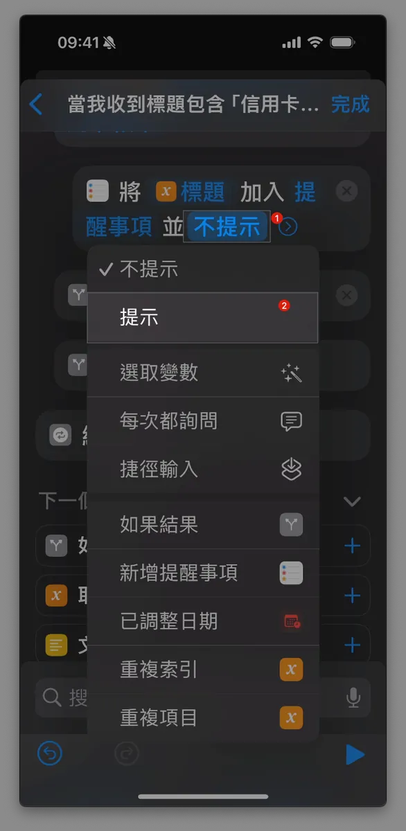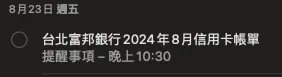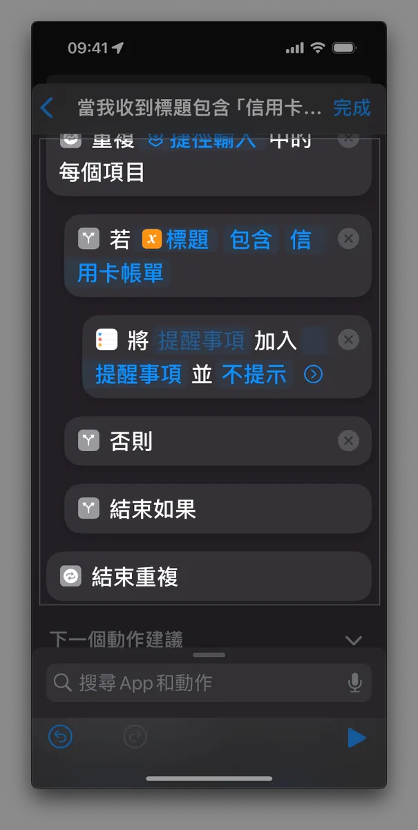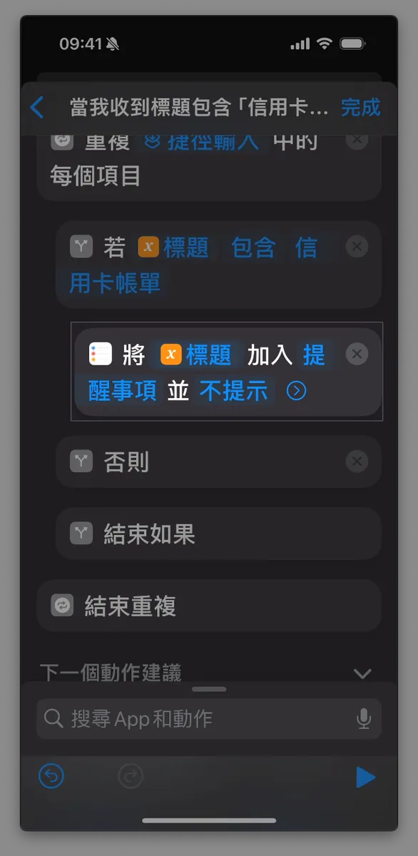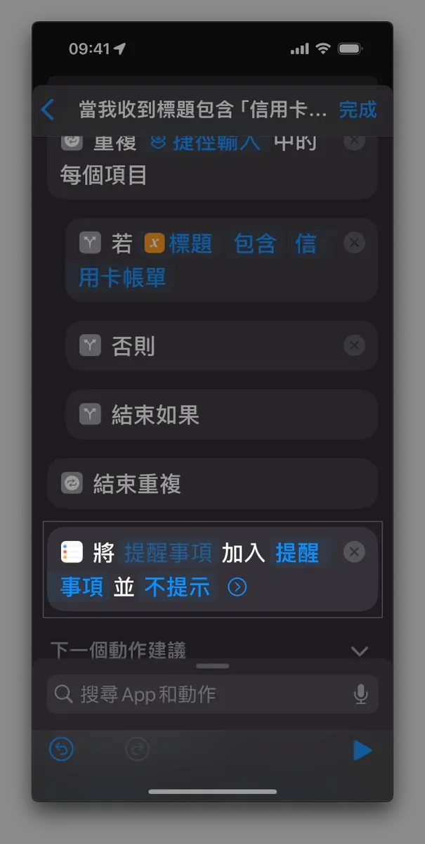 Another life notification is the credit card bill alert; set it up like an SMS, so when an email is received, it can also trigger a shortcut automation to add a reminder. However, since automation features are not yet available to third-party apps, it can only be triggered using Apple’s Mail App.