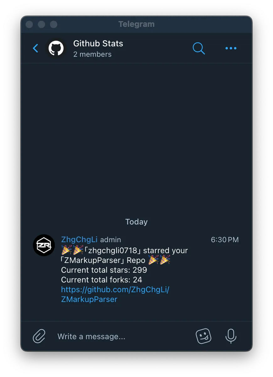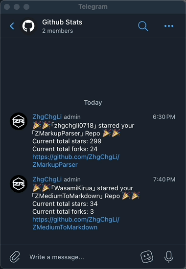 Verification successful! When someone stars my Repo, the notification is correctly sent to the Telegram Group! 🎉🎉🎉