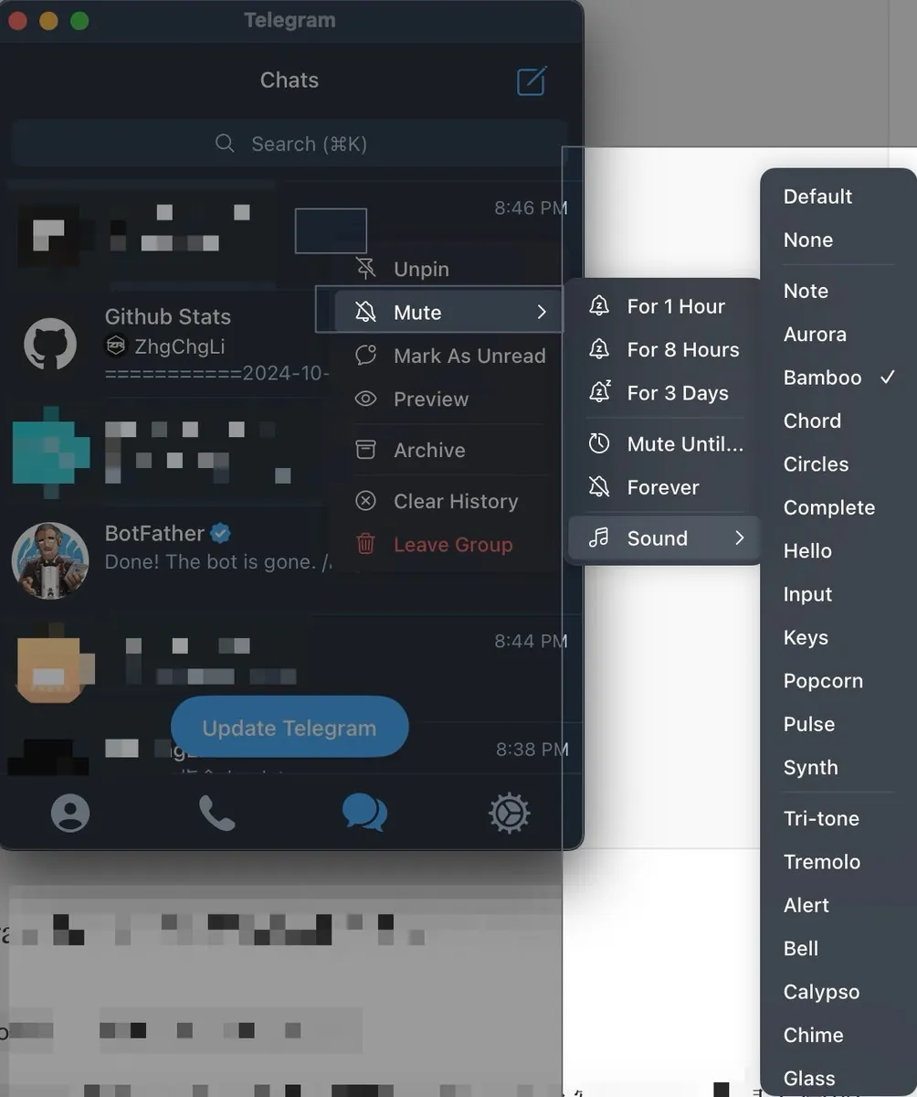 ❌ Cannot set special settings for individual messages (such as notification sound, mute…)
